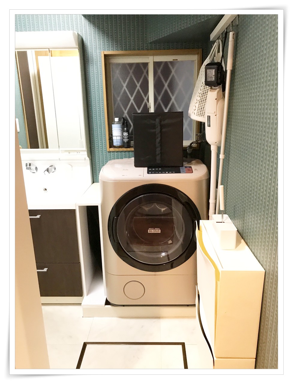 一階に降りて、ビッグドラムからでき上がった洗濯物ををスクップに移し替え、洗濯機の上におきます。