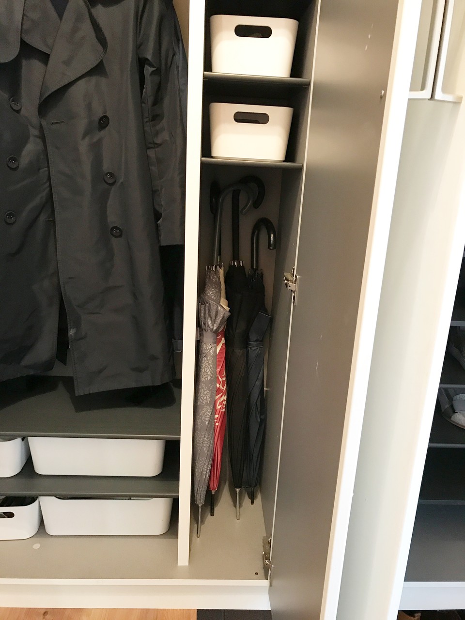 うんうん!下駄箱が全て棚で仕切られていたら傘が入らないですね。そんな時は見た目のスッキリとした傘たてに立てたり、壁にフックをつけてかけて収納したり、昔私がやっていたように扉の内側にタオルハンガーを貼り付けて傘を収納する方法はどうでしょう。