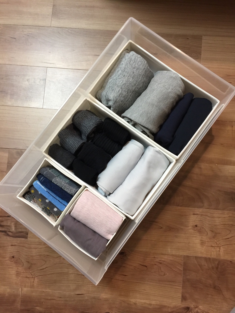 衣類は仕切ってしまうと、大きな引き出しケースの中でもスッキリ収納できます。