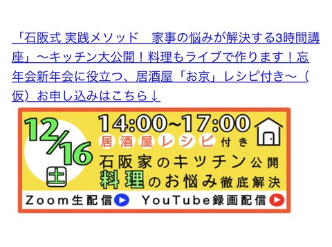 【今年最後のオンラインイベント】石阪家のキッチン大公開!居酒屋お京レシピ付きです! 2023年11月19日 <現在開催中のイベントについて>「3ヶ月見られる! 石阪式実践メソッド 家から不要な書類がバッサリなくなる!『人生が変わる 紙片づけ!』」8月18日~11月30日視聴版お申し込みはこちら↓「石阪式 実践メソッド 家事の悩みが解決する3時間講座」〜キッチン大公開!料 ... 続きを読む タグ :#片づけ#収納#家事#暮らし#整理収納#インテリア#片付け#石阪京子#3日片づけ#7割収納