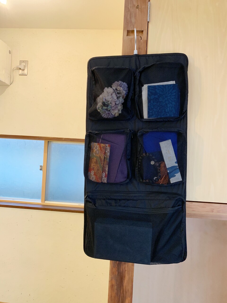 こんなふうに、コサージュ、ハンカチ、数珠やストッキングなども入れられて、ファスナーでしめられるのでクローゼットの中で落っこちることもありません。