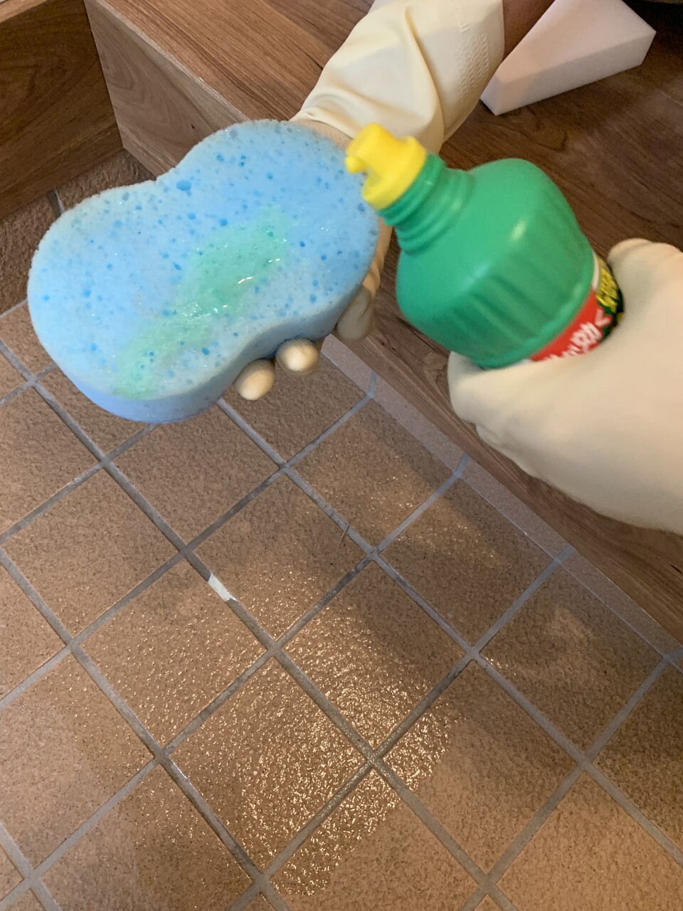 サンポールをスポンジにつけて満遍なくのばして、