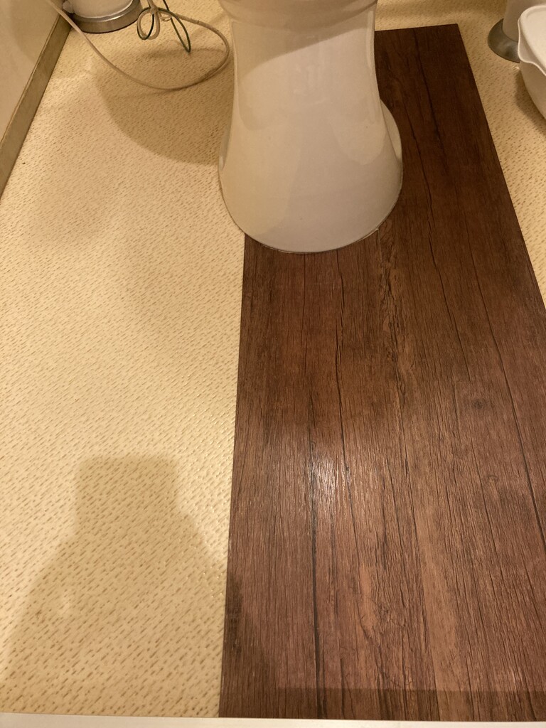 フロアタイルは硬さが様々なので、トイレのような障害物がある場所に貼る場合は、ハサミで切ることができる柔らかいものを選びます。