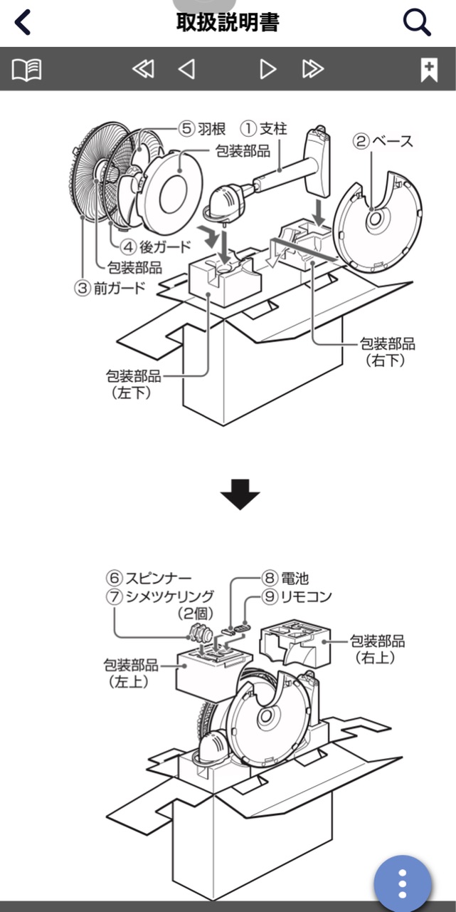 こちらの扇風機も、取説を見るとお手入れ後、四角い箱にしまえました。