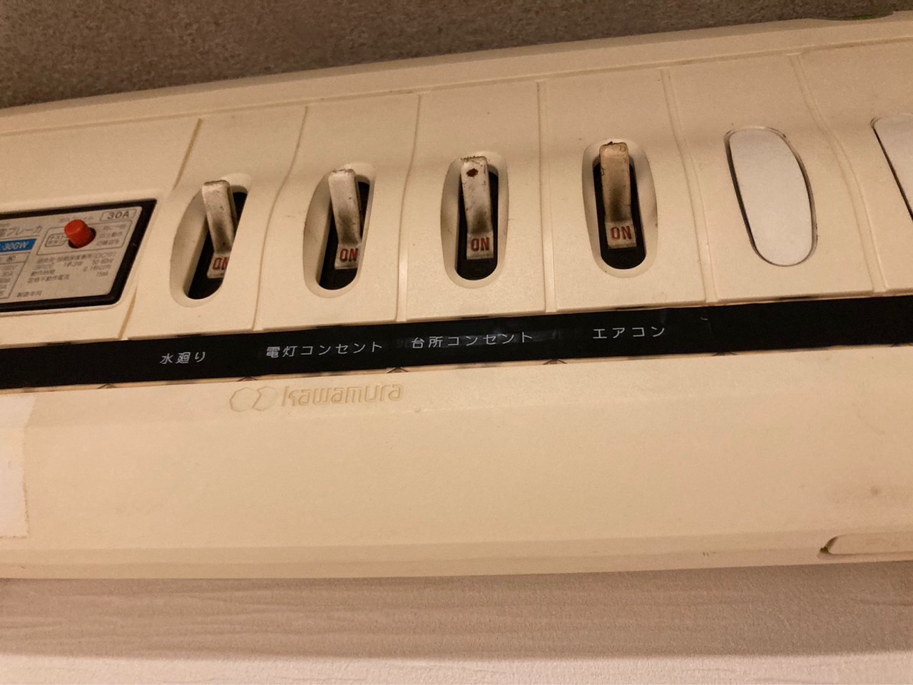 平成レトロ感が醸し出されてしまっているのがこちらの分電盤です。