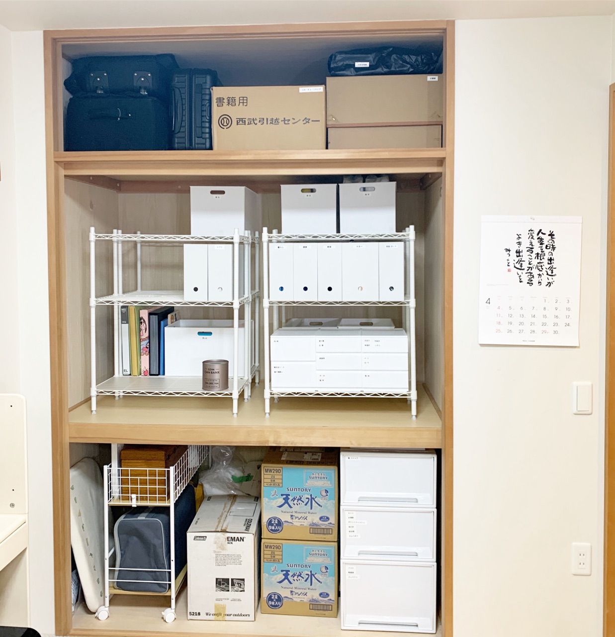 家族の共有品の書類や備蓄水、裁縫道具や文房具、雛人形などを収納します。