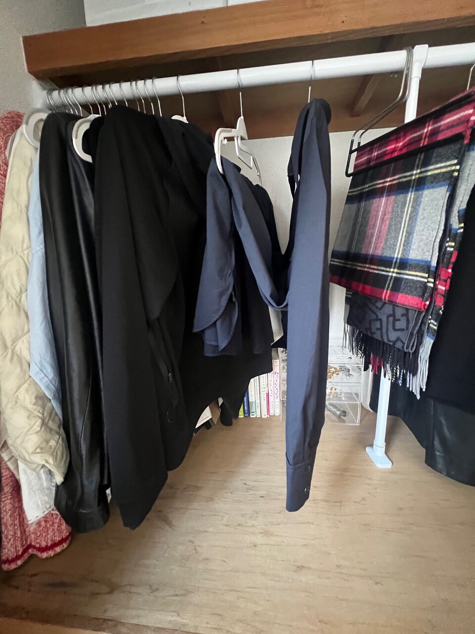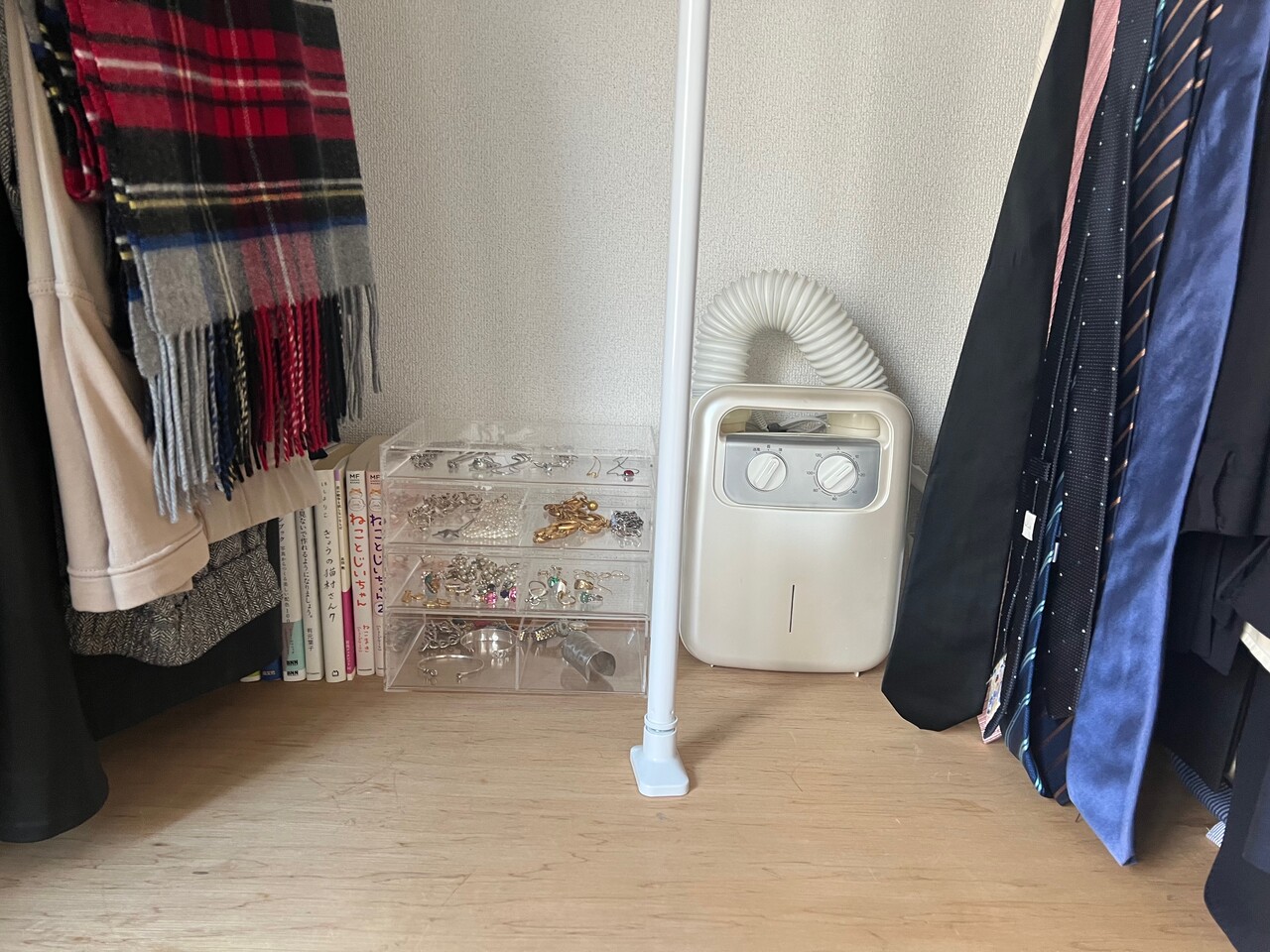 押入れの衣類収納の奥には、アクセサリー類、本、