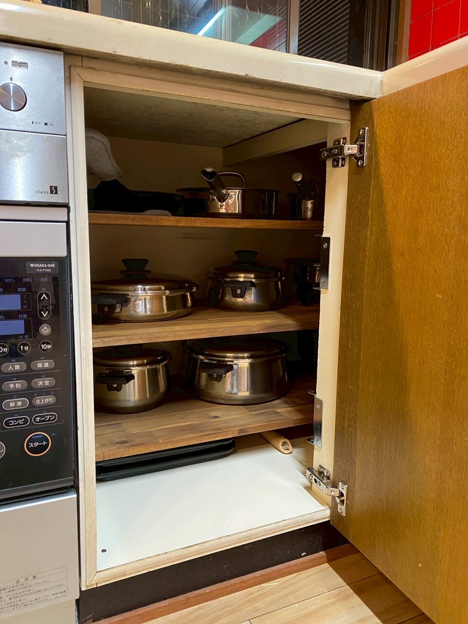 これにより、シンク下から鍋を移動できるようになり、これまで鍋で埋まっていたスペースがすっきり空きました。