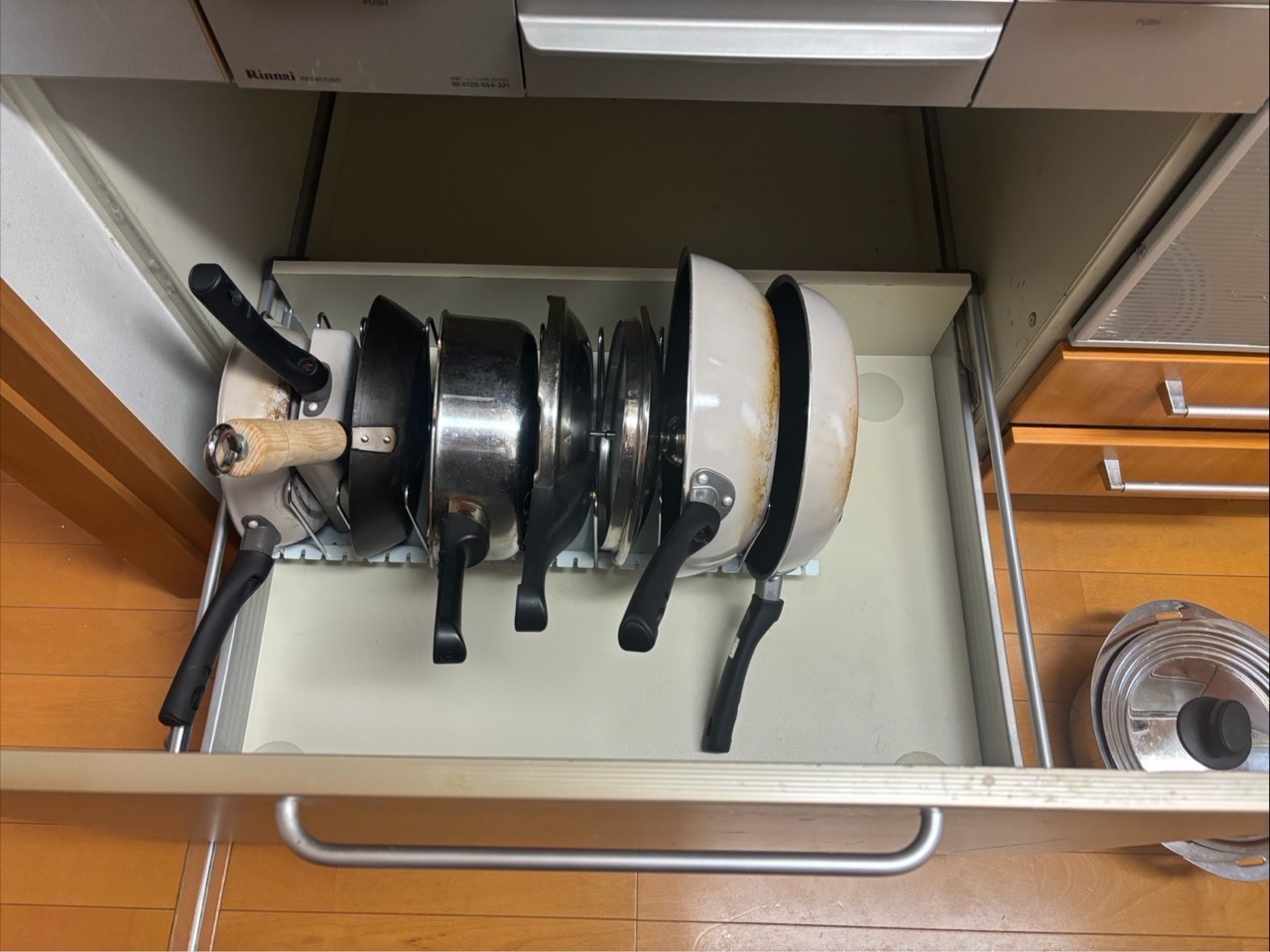 鍋やフライパンを入れると、フライパンの持ち手が邪魔で今度は調味料が入らない…!と困っておられたんですね。