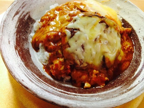 冷凍しておいたハンバーグで デミソースチーズハンバーグ丼