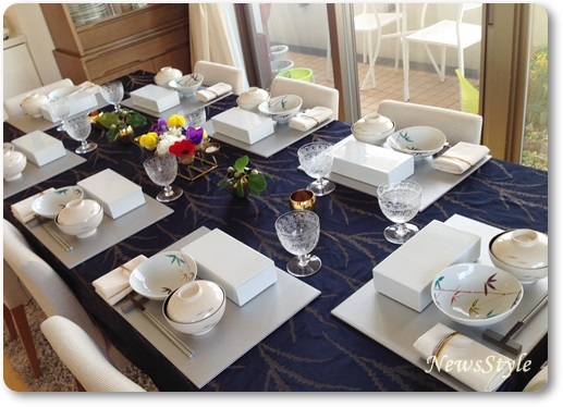 藍色のテーブルクロスに白い器が爽やかな和のおもてなしのテーブル