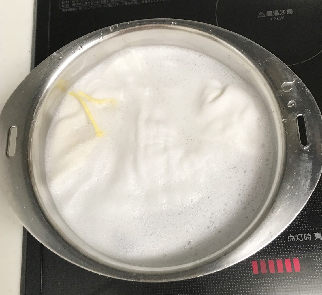 と 、他のふきんたちと一緒にまとめてオキシクリーン溶液で煮てみました。