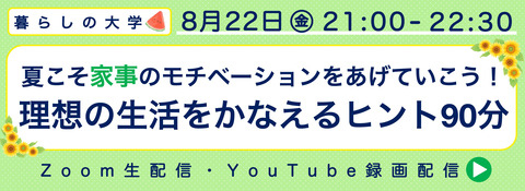 【お知らせ】暮らしの大学「夏こそ家事のモチベーションをあげていこう! 理想の生活をかなえるヒント90分」 を開催します! 2025年07月18日 <現在開催中のイベントについて>「リアル開催! 石阪式紙片づけメソッド家から不要な書類がバッサリなくなる!『人生が変わる 紙片づけ!』」お申し込みはこちら↓2025年7月~2025年10月視聴版「3ヶ月見られる! 石阪式基本メソッド 一生散らからない秘密 90分で人生 ... 続きを読む タグ :#片づけ#収納#家事#暮らし#整理収納#インテリア#片付け#石阪京子#3日片づけ#7割収納