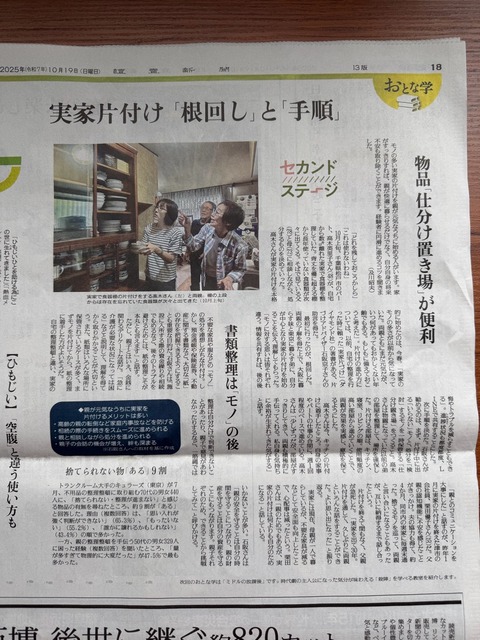 【読売新聞掲載】親が元気なうちに始める「実家の片づけ」 2025年10月20日 <現在開催中のイベントについて>「石阪京子と気軽におしゃべり会 in東京 ~リアルでお会いしましょう~」お申し込みはこちら↓「リアル開催! 石阪式紙片づけメソッド家から不要な書類がバッサリなくなる!『人生が変わる 紙片づけ!』」 お申し込みはこちら↓Zoomオン ... 続きを読む タグ :#片づけ#収納#家事#暮らし#整理収納#インテリア#片付け#石阪京子#3日片づけ#7割収納
